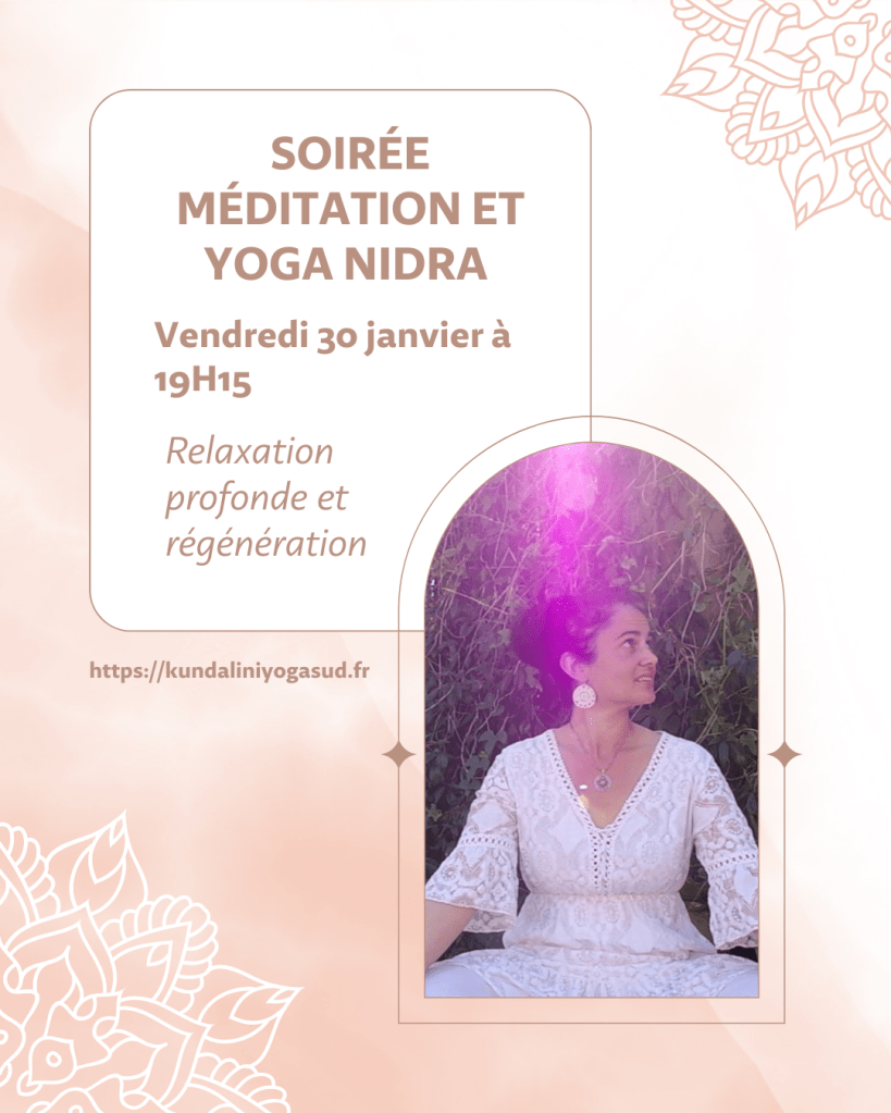 Je vous propose le vendredi 30 à 19h15 une soirée médiation et yoga nidra Quelques exercices physiques pour revenir présent dans le corps Des exercices de respiration pour approfondir l’espace méditatif Un yoga nidra : yoga du sommeil conscient: relaxation très profonde guidée : comme une mise en jour de son système : relâchement et régénération : sortir du stress et équilibrer le sommeil Durée 1h15 tarif 15 euros